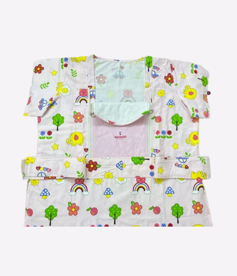 Front flap open to make breast-feeding and holding comfortable, convenient for long use. ; Easily auto clave, washable. ; Reusable. ; Up to the minute design for hip and neck support to the baby. ; Locking technique for hands-free safe and secure therapy. ; Finest baby friendly cotton fabric with three layers in front. ; UV treated.